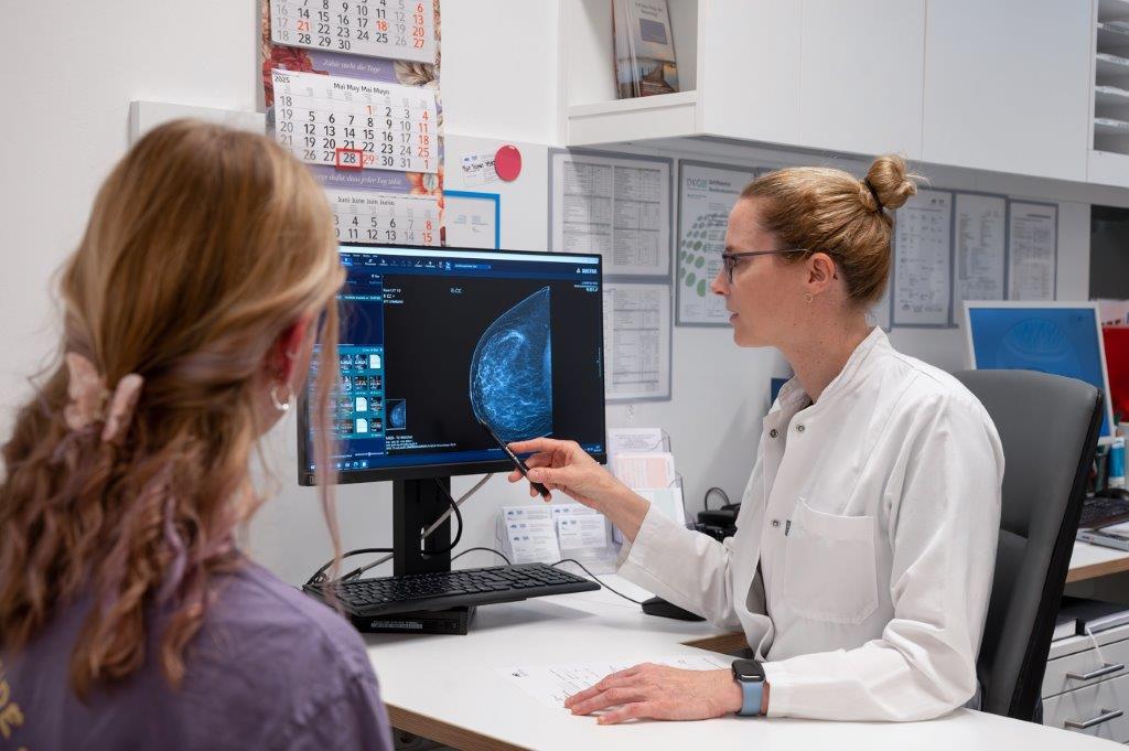Brustkrebs (Mammakarzinom) ist die häufigste Krebserkrankung der Frau mit 74 500 Neuerkrankungen pro Jahr in Deutschland, beim Mann etwa 690 Neuerkrankungen pro Jahr. Am häufigsten erkranken Frauen nach den Wechseljahren, jedoch erkrankt jede 6. Patientinnen vor dem 50. Lebensjahr. Symptome der Erkrankung sind tastbare Verhärtungen/Knoten in der Brust oder Achselhöhle, Hauteinziehungen der Brust oder Flüssigkeitsabsonderung der Brustwarze und eine Veränderung der Größe oder Form der Brust. Diese Symptome sollten vorerst mittels Ultraschalluntersuchung abgeklärt werden. Zur weiteren Abklärung wird bei Verdacht auf Brustkrebs wird eine Mammographie durchgeführt und eine Gewebeprobe der Brust entnommen. Falls sich der Verdacht auf ein Mammakarzinom bestätigt, wird in unserer interdisziplinären Tumorkonferenz das weitere Therapiekonzept festgelegt. Je nach Art und Erkrankungsstadium wird weitere Bildgebung zum Ausschluss von Fernabsiedelungen veranlasst (CT, Skelettszinitgrafie, MRT).
